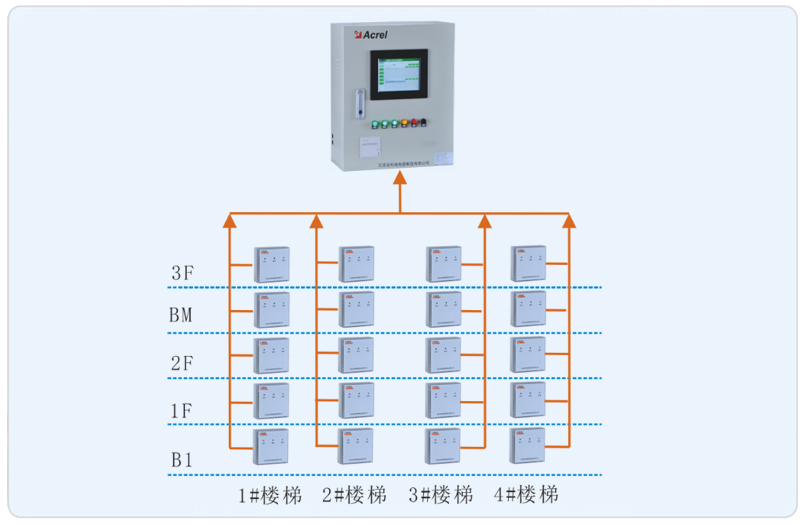 系統(tǒng)采用安科瑞防火門監(jiān)控系統(tǒng),該系統(tǒng)主要采用分層分布式網(wǎng)絡(luò)結(jié)構(gòu),系統(tǒng)結(jié)構(gòu)為:站控管理層、網(wǎng)絡(luò)通訊層和現(xiàn)場設(shè)備層。其中黃巖博物館項(xiàng)目現(xiàn)場設(shè)備分布為B1至3F常閉防火門。該系統(tǒng)監(jiān)控所有樓道內(nèi)的常閉防火門且實(shí)時監(jiān)測防火門狀態(tài),如有異常會后臺報警。所有監(jiān)測模塊通過二總線鋪設(shè)至消防控制室,防火門監(jiān)控主機(jī)從而完成對監(jiān)測模塊的采集并監(jiān)控。