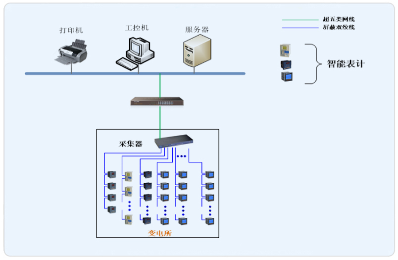 系統(tǒng)采用Acrel-2000型電能管理系統(tǒng),整個(gè)系統(tǒng)采用網(wǎng)絡(luò)分布式結(jié)構(gòu),監(jiān)控主機(jī)位于變電所內(nèi)值班室,變電所內(nèi)配置一套采集設(shè)備進(jìn)行數(shù)據(jù)的采集,所有配電回路均配備智能儀表。該項(xiàng)目實(shí)現(xiàn)了安國酒店變電所的配電回路重要數(shù)據(jù)的實(shí)時(shí)采集,存儲(chǔ),顯示。所有監(jiān)控設(shè)備均通過屏蔽雙絞線連接至采集箱的通訊采集器,再通過網(wǎng)線將數(shù)據(jù)傳輸至系統(tǒng)主機(jī),從而實(shí)現(xiàn)電力監(jiān)控系統(tǒng)的整體搭建。